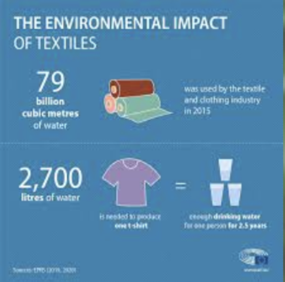 The way in which clothes are made has a massive influence on the world. For example, treating and dyeing fabric tends to leak chemicals and microfibers into oceans and rivers, which tend to harm marine life. Figure 1 shows that to produce one cotton T-shirt, it requires around 2,700 liters of water as noted by the University of Waterloo (2019). Furthermore, demonstrates how dependent the industry is on freshwater. The circular economy is one solution to this problem. It is all about reducing, reusing, and recycling products instead of wasting them. The Ellen MacArthur Foundation (2017) has prompted brands like Burberry and Stella McCartney to embrace more sustainable manufacturing processes. MacArthur was motivated by her sailing around the globe and observing how the world was susceptible.